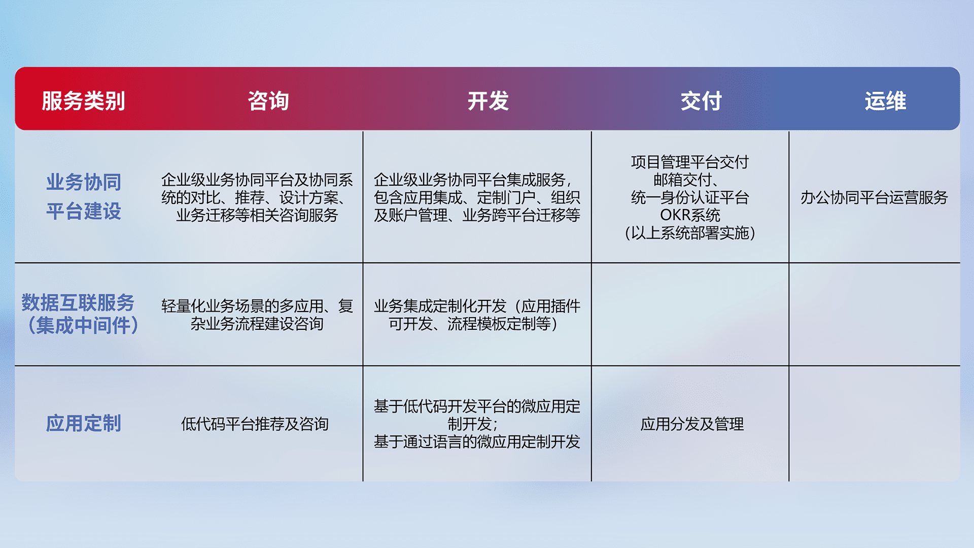 针对钉钉、、企微、、IDaas等平台级产品提供产品的规划、、方案、、、交付、、定制化开发等服务,,,实现如统一协同办公、、、智能客户服务、、、、混合会议管理、、、智能数据查询、、、等业务场景,,实现数字化转型。。。。