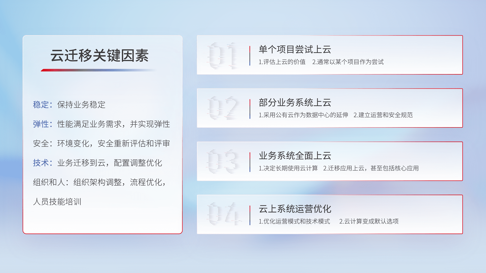 结合实际业务,,从规划设计、、、云平台选型、、、、云原生改造、、、、数据迁移、、、集成交付,,,,迁移全过程为客户识别最佳上云路径,,,,做好风险识别管理,,设计网络架构、、身份权限、、安全审计合规、、、、操作审计、、、、日志审计、、、监控告警策略、、多站点容灾设计等,,,对云上基础设施进行整体规划,,,提升IT治理水平,,,,以满足弹性、、高可用、、、、高性能的需求。。。