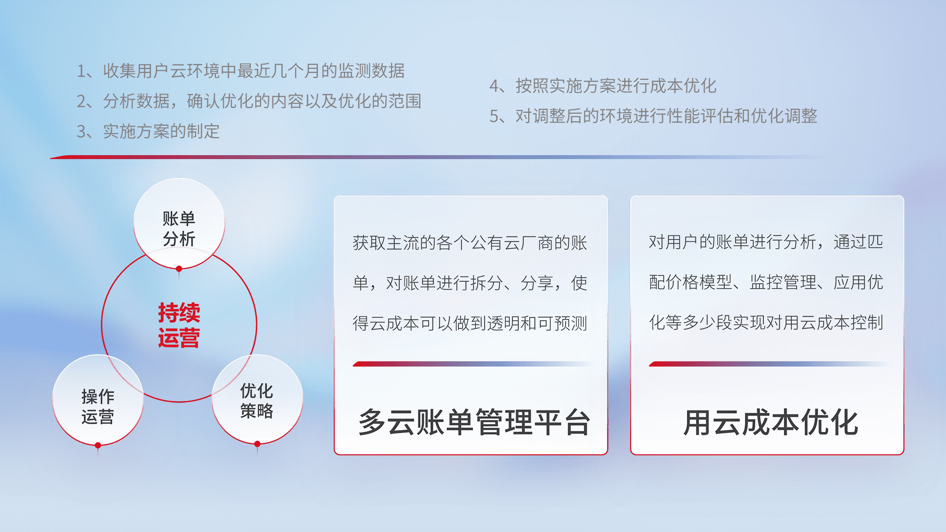 通过多云纳管,,,以统一的资源数据模型把客户的云资源进行抽象和封装,,,进而实现对多云资源的统一操作,,保障云资源管理的可靠性、、、稳定性与可用性。。量身定制化运维内容,,,,配置、、、开发运维、、、补丁管理、、、、备份、、监控、、、认证和访问管理、、、、审计和日常巡检等,,保障在用云过程中的可靠度,,,,稳定度以及高可用率。。
